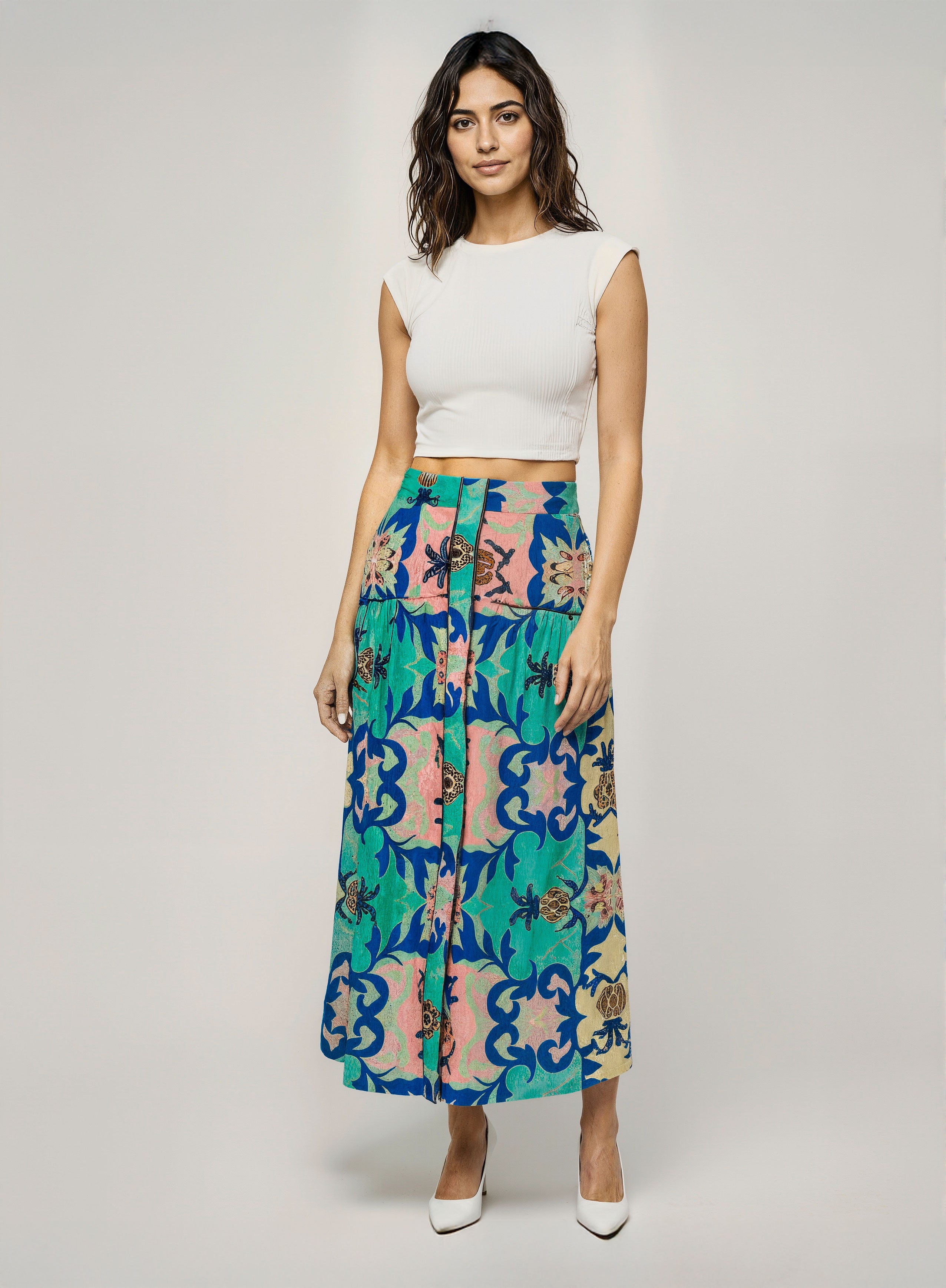 The Genny-Dust Midi Skirt is made from cotton poplin. This tiered skirt features a vibrant patchwork-style print with panels of mint green, pink, and yellow, adorned with intricate blue and brown floral and paisley motifs. It has a button-down front, a flattering A-line silhouette, and a midi length, creating a chic and comfortable look.