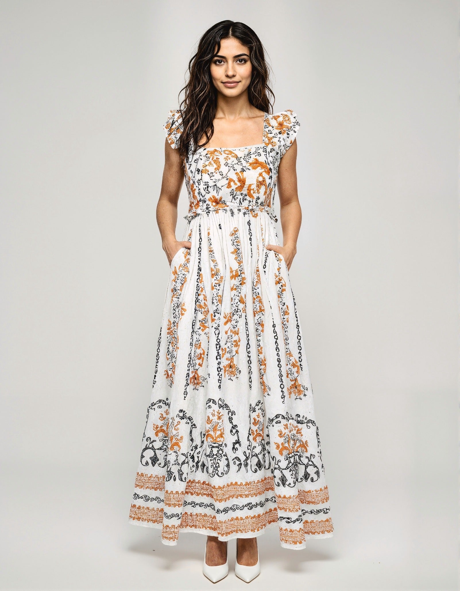 The Liora Midi Dress is made from cotton dobby fabric, known for its subtle woven texture. This elegant dress features a beautiful floral print with vibrant orange flowers and green leaves on a white background. It has a smocked bodice with ruffled straps and a square neckline, creating a flattering and comfortable fit. The flowing midi-length skirt is adorned with vertical floral stripes and a wide, intricate patterned border at the hem.