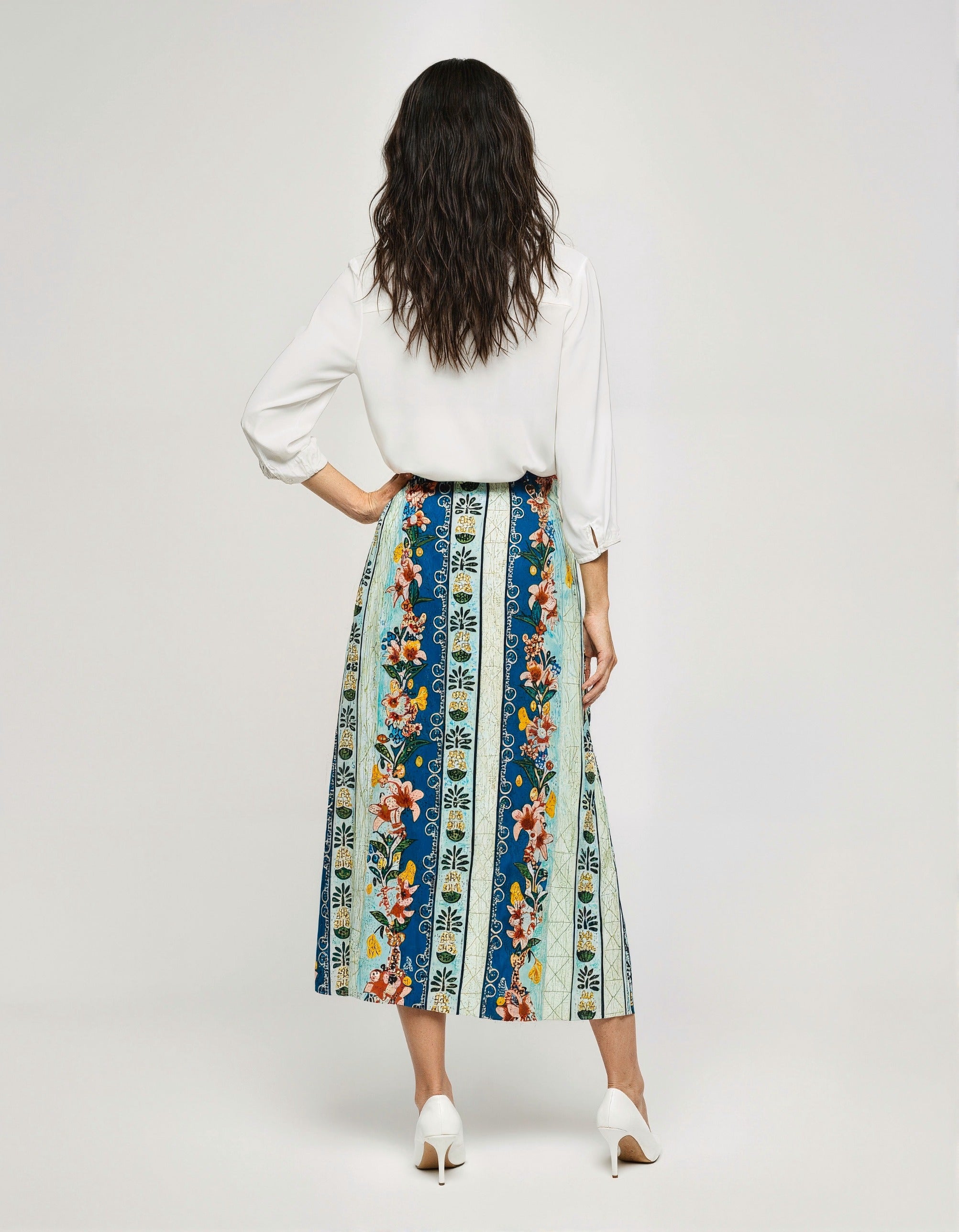 Crafted from crisp 50s cotton poplin, the Maya-Mint Maxi Skirt is a timeless and graceful piece. This high-waisted maxi skirt features a flattering fit with an elasticated back and a flowy A-line silhouette. The beautiful contrast-color embroidery and playful print add a charming touch, making it a versatile and elegant addition to your wardrobe.