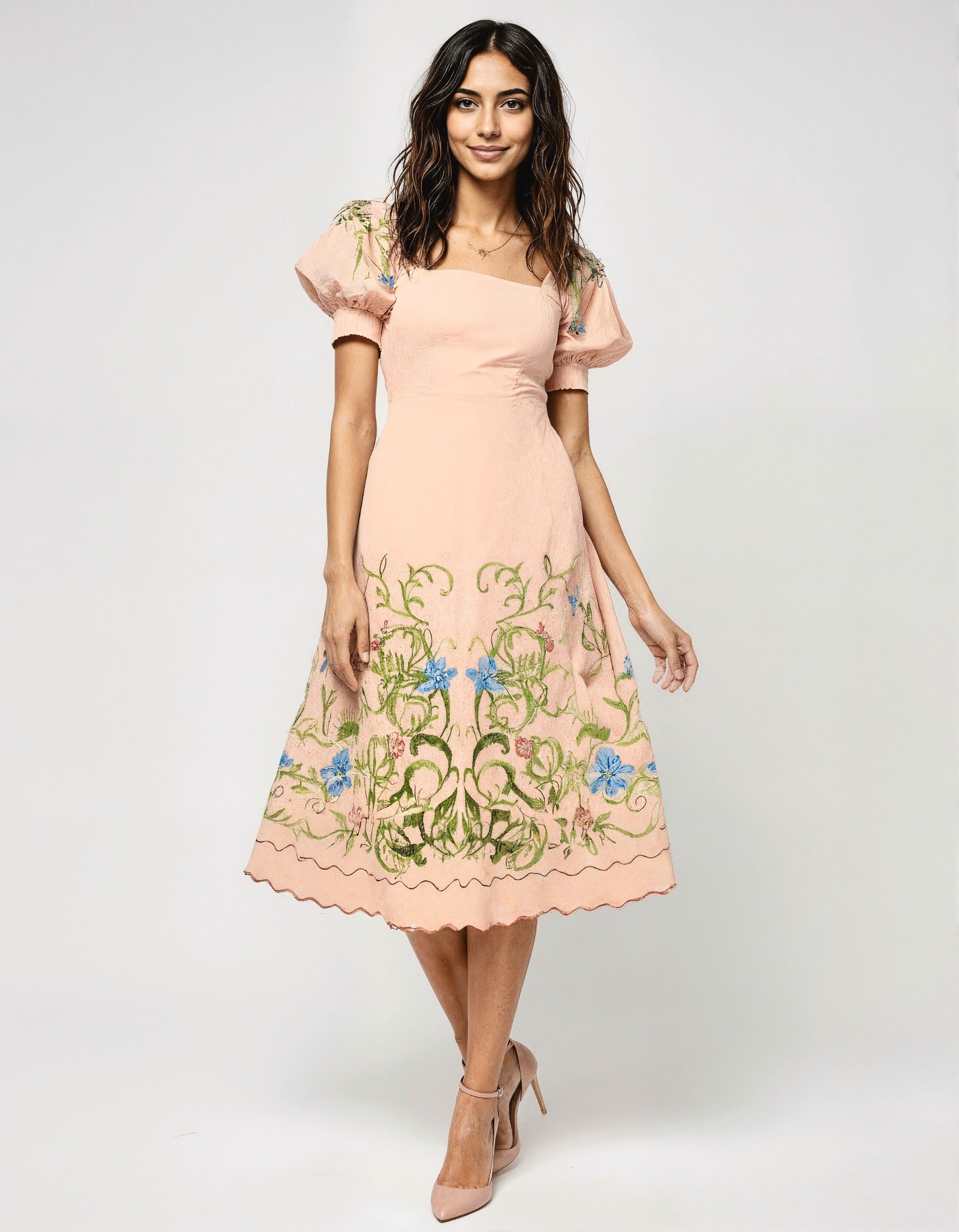 Inspired by garden romance, the ROSALIE-HAZE MIDI DRESS is a captivating piece that combines classic femininity with modern elegance. This charming puff-sleeve midi dress features a soft, blush pink fabric that creates a beautiful backdrop for the intricate floral print.