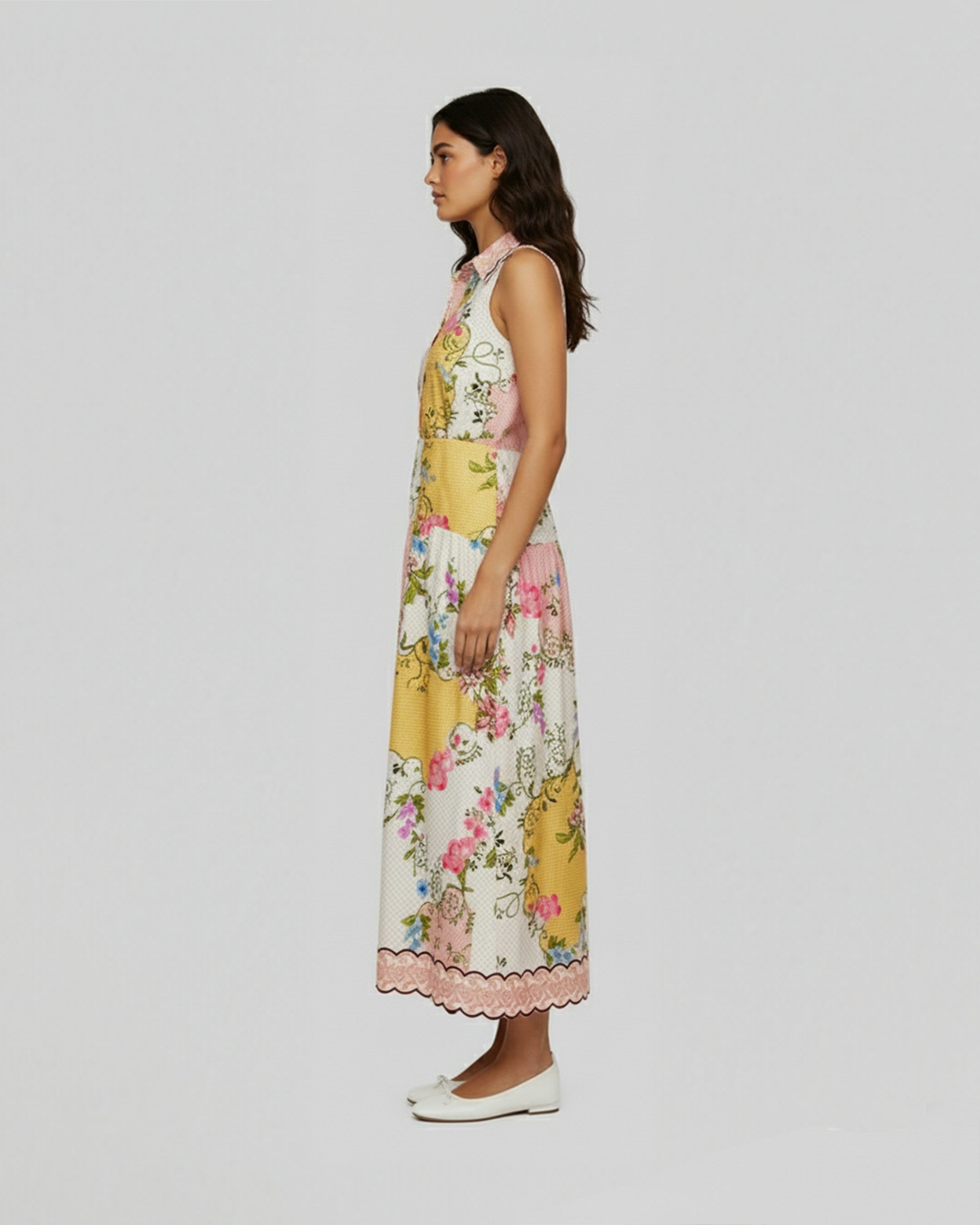 Crafted from a breezy 40s cotton slub, the Senna-Bloom Maxi Dress is a perfect choice for sun-drenched days. This charming maxi dress features a stylish collar and a relaxed, flowing silhouette. The patchwork floral print adds a whimsical touch, making it a beautiful and effortless statement piece.