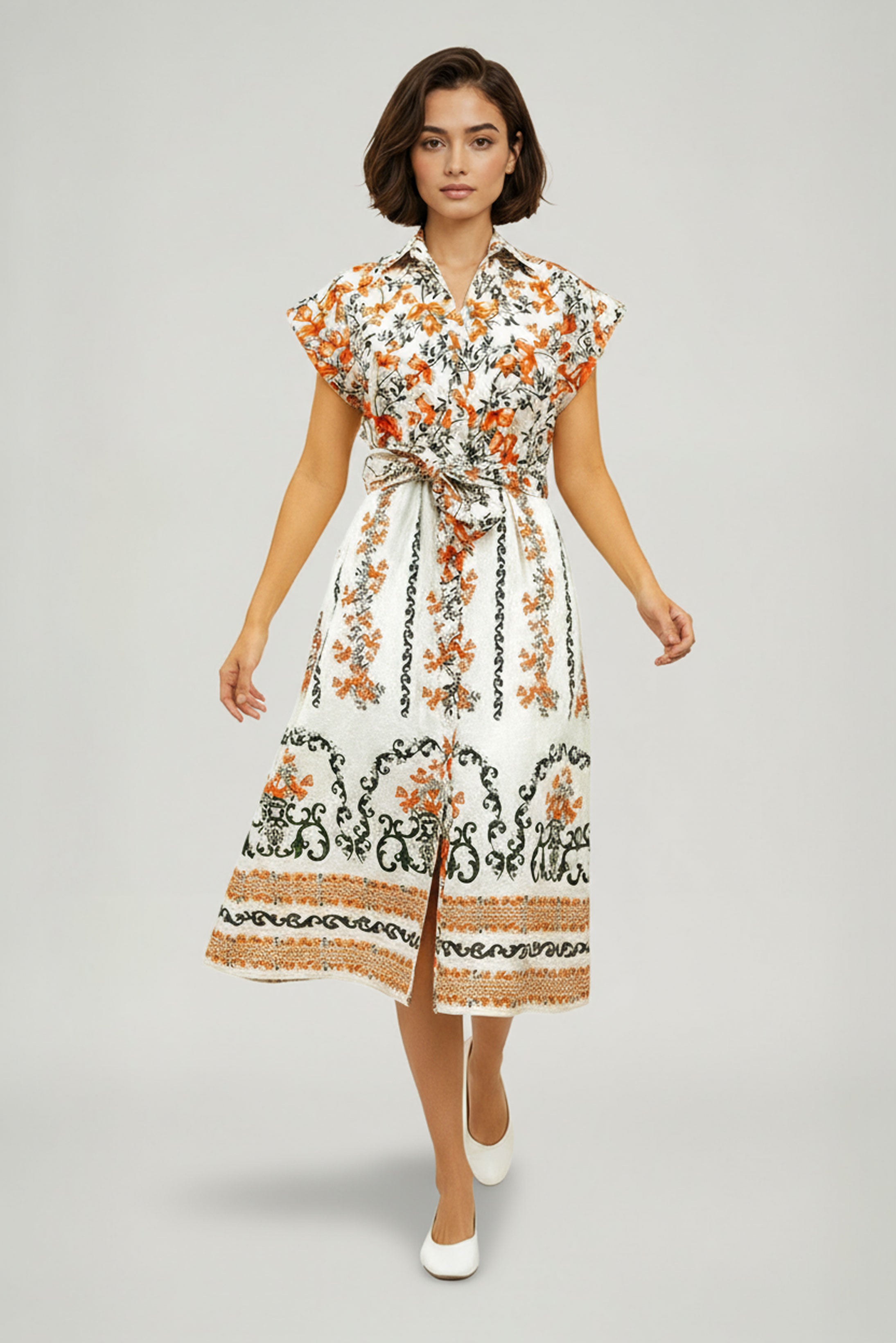 The Thalia-Ivory Midi Dress is crafted from cotton dobby fabric, known for its subtle woven texture. This dress features a sophisticated shirt-dress style with a collared V-neckline and cap sleeves. The design includes a striking placement print with a vibrant mix of orange flowers and green leaves. A self-fabric belt cinches the waist, and the dress has a button-down front that leads into a flowing A-line midi skirt, finished with a detailed ornamental border at the hem.